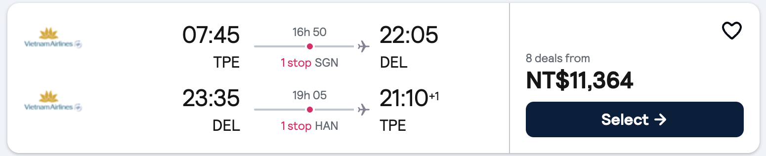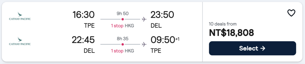 台灣飛往印度航班眾多,亞洲各大機場都有轉機點,以下僅就「最便宜」「最舒適」二者做搜尋,大家可以自行針對喜歡的航班做預定。