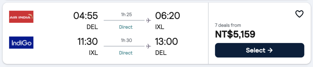 • 去程DEL/IXL:夏季德里氣候炎熱,熱氣流容易影響航班起降,建議買早上第一個航班。